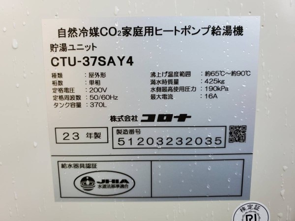 富岡市田篠 コロナ自然冷媒CO2家庭用ヒートポンプ給湯機 貯湯ユニットCTU-37SAY4 エコキュート交換工事|群馬県のエコキュート専門交換工事店|群馬エコキュート交換ショップ補助金対応可能