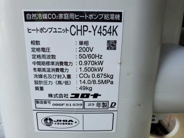伊勢崎市緑町 コロナ自然冷媒CO2家庭用ヒートポンプ給湯機 ヒートポンプユニットCHP-Y454K エコキュート交換工事
