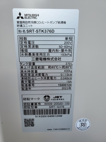 渋川市有馬 三菱電機自然冷媒CO2家庭用ヒートポンプ給湯機貯湯ユニットSRT-STK376D エコキュート交換工事