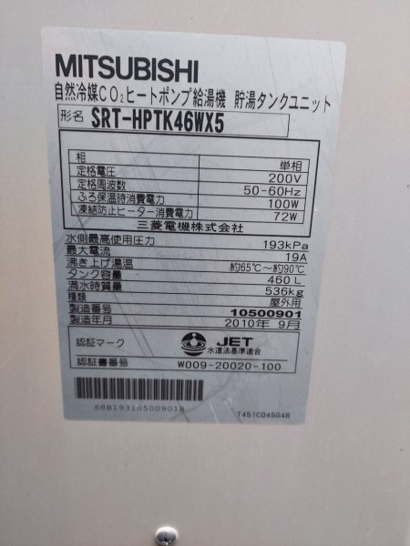 沼田市清水町 三菱電機エコキュートSRT-HPTK46WX5→三菱電機家庭用自然冷媒CO2ヒートポンプ給湯機貯湯ユニットSRT-STK376D エコキュート交換工事