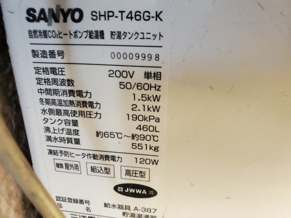 渋川市有馬 SANYOエコキュート→コロナ自然冷媒CO2家庭用ヒートポンプ給湯機ヒートポンプユニットCHP-Y454K エコキュート交換工事