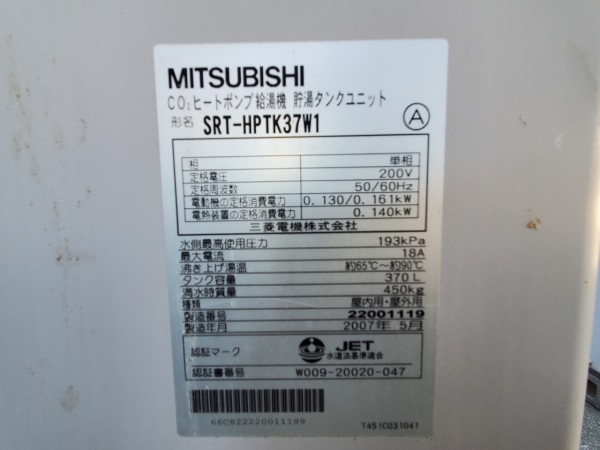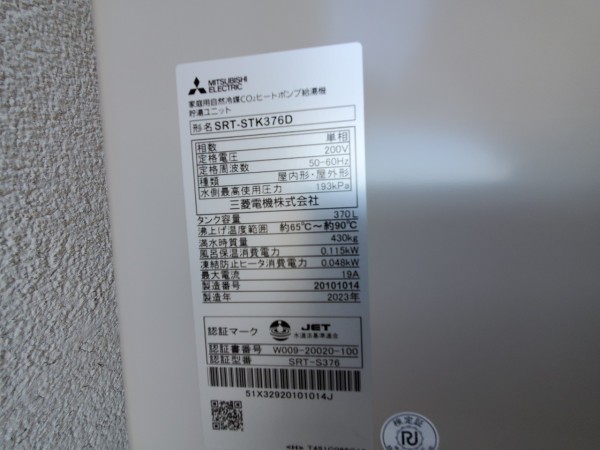 前橋市青葉町 三菱電機エコキュート→三菱電機自然冷媒CO2家庭用ヒートポンプ給湯機貯湯ユニットSRT-STK376D エコキュート交換工事