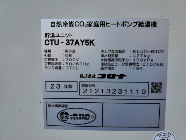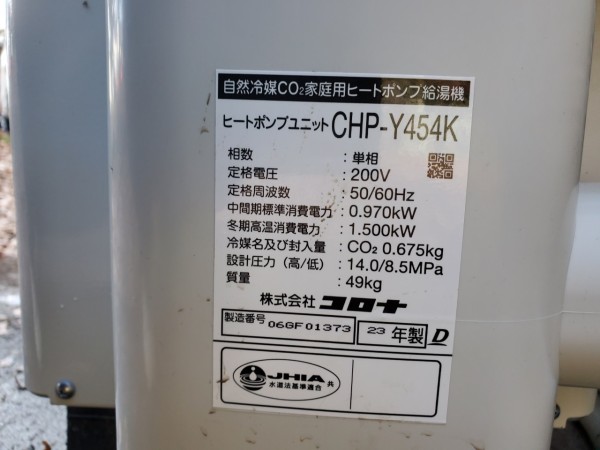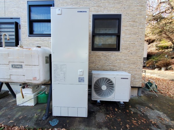 前橋市泉沢町 コロナ自然冷媒CO2家庭用ヒートポンプ給湯機ヒートポンプユニットCHP-Y454K、貯湯ユニットCTU-37AY5K エコキュート交換工事
