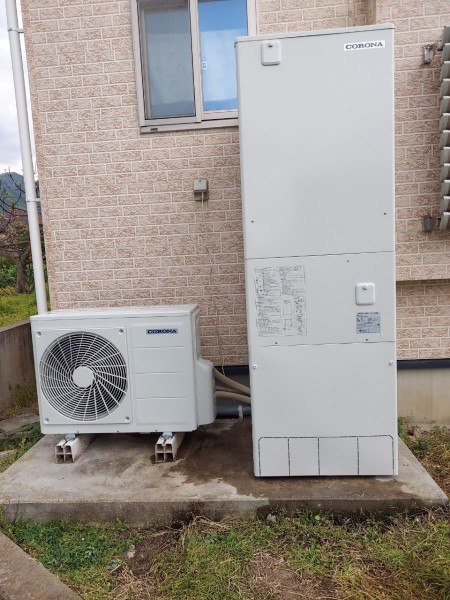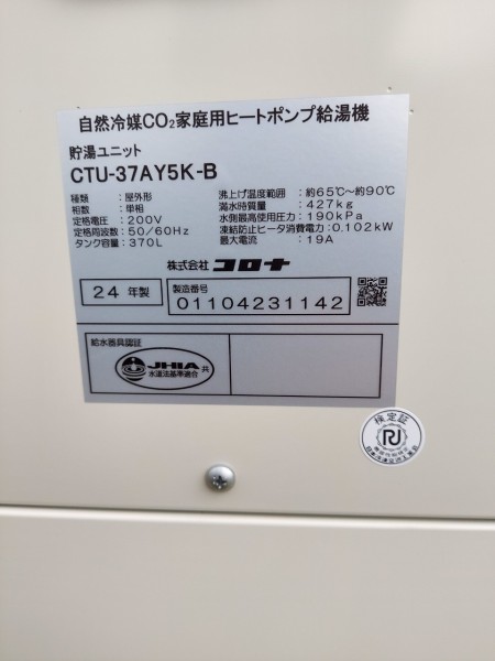 富岡市田篠 コロナ自然冷媒CO2家庭用ヒートポンプ給湯機貯湯ユニットCTU-37AY5K-B、ヒートポンプユニットCHP-Y454K エコキュート交換工事