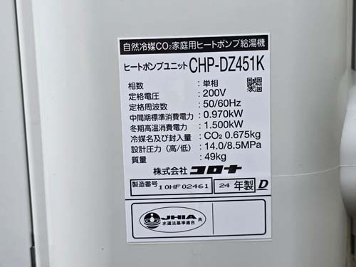 渋川市石原 コロナ自然冷媒CO2家庭用ヒートポンプ給湯機 ヒートポンプユニットCHP-DZ451K エコキュート交換工事