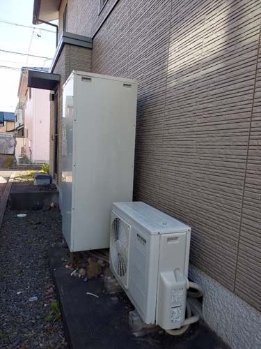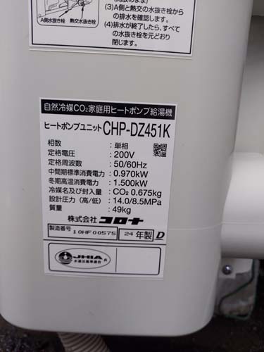 高崎市嘉多町 コロナエコキュート→コロナ自然冷媒CO2家庭用ヒートポンプ給湯機 ヒートポンプユニットCHP-DZ451K エコキュート交換工事