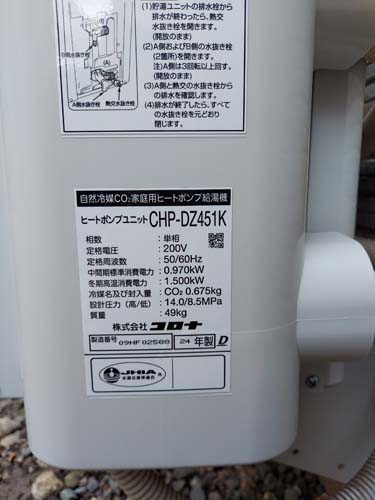 みどり市笠懸町鹿 コロナ自然冷媒CO2家庭用ヒートポンプ給湯機 ヒートポンプユニットCHP-DZ451K エコキュート交換工事|群馬県のエコキュート専門交換工事店|群馬エコキュート交換ショップ補助金対応可能