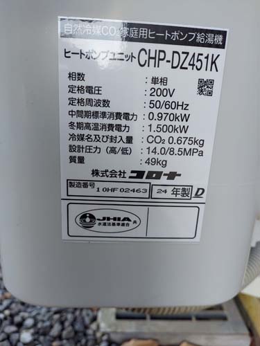 館林市若宮町 コロナ自然冷媒CO2家庭用ヒートポンプ給湯機 ヒートポンプユニットCHP-DZ451K エコキュート交換工事