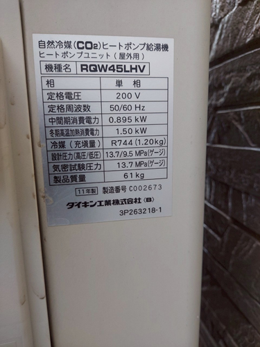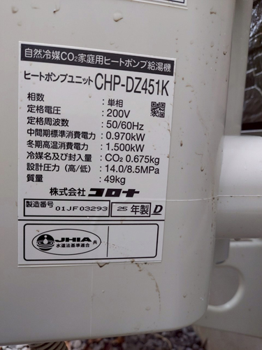 安中市野殿 ダイキン自然冷媒CO2ヒートポンプ給湯機ヒートポンプユニットRQW45LHV→コロナ自然冷媒CO2家庭用ヒートポンプ給湯機貯湯ユニットCTU-37AZ1K、ヒートポンプユニットCHP-DZ451K エコキュート交換工事
